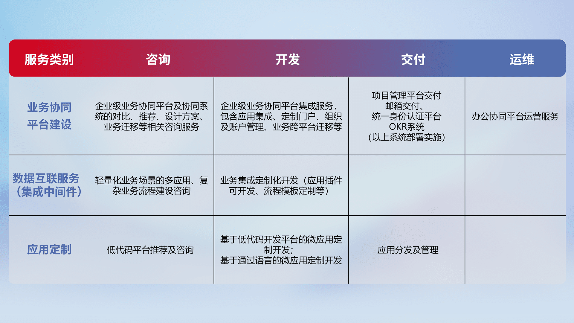 针对钉钉、、企微、、IDaas等平台级产品提供产品的规划、、、方案、、、、交付、、、定制化开发等服务,,,,实现如统一协同办公、、智能客户服务、、混合会议管理、、、智能数据查询、、、、等业务场景,,实现数字化转型。。