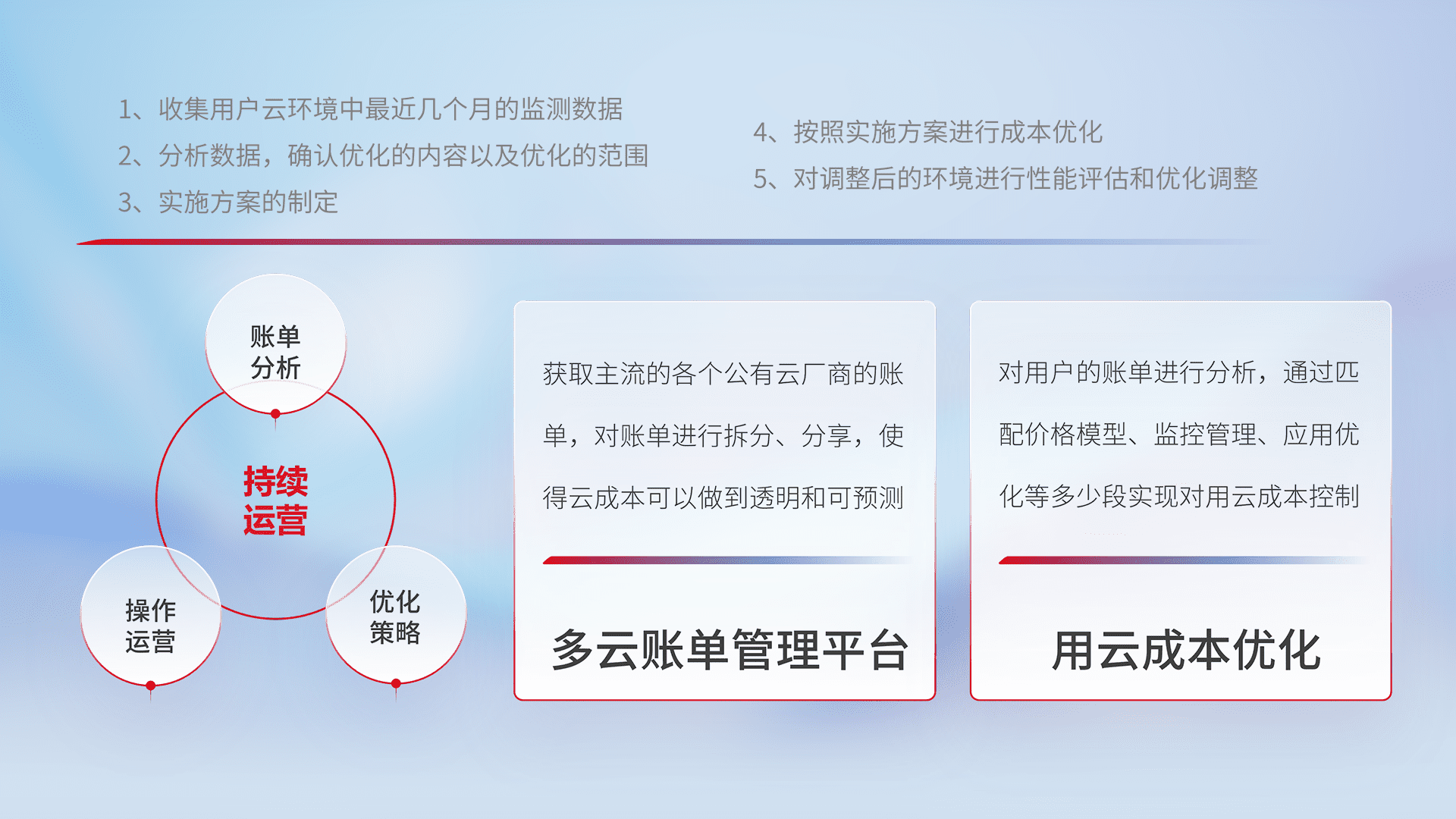 通过多云纳管,,以统一的资源数据模型把客户的云资源进行抽象和封装,,,进而实现对多云资源的统一操作,,,,保障云资源管理的可靠性、、、稳定性与可用性。。。。量身定制化运维内容,,,,配置、、、开发运维、、、、补丁管理、、、、备份、、、、监控、、、认证和访问管理、、、审计和日常巡检等,,,,保障在用云过程中的可靠度,,,稳定度以及高可用率。。。。